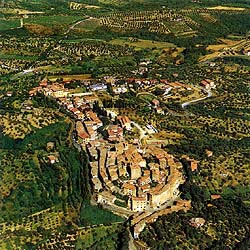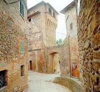 Panicale conserva ancor oggi il suo antico borgo medioevale circondato dalla potente cinta muraria, “sorvegliata” da dieci torri, e la caratteristica suddivisione dell’abitato con forme circolari con le sue tre piazze distinte e separate: quella del Comune, in basso; quella dominata dalla chiesa della Collegiata, al centro; quella del Podestà, in alto. Si entra nel borgo varcando Porta Perugina, ricostruita nel 1898. Percorrendo via Caporali si giunge al Teatro Cesare Caporali costruito nel 1786 e rifatto nel 1858 da Giovanni Caproni; recentemente restaurato, il caratteristico e bel teatro a due ordini di palchi, custodisce un sipario raffigurante “L’ingresso di Boldrino a Perugia” opera del 1869 di Mariano Piervittori. Proseguendo raggiungiamo il punto più alto del paese dove domina il Palazzo del Podestà, massiccia costruzione edificata nel XIV sec. dai Maestri Comacini, mentre il Campanile è del 1789. Il palazzo, di recente restaurato, ospita l’Archivio Notarile con manoscritti (il più vecchio dei quali è del 1311) e l’Accademia Masoliniana. Scendendo verso piazza S. Michele, incontriamo la casa, tutta in cotto, di Boldrino Panieri, la cui facciata è arricchita da stemmi gentilizi; quindi la Collegiata di S. Michele Arcangelo che si apre nell’omonima piazza, edificata dal 1680 al 1695 su un antichissima chiesa risalente forse all’anno Mille e che nel 1618 venne elevata a Collegiata. Al suo interno custodisce pregevoli opere d’arte: una “Natività” del 1519 opera di Giovan Battista Caporali un'”Annunciazione“, attribuita a Masolino; un Crocifisso ligneo del XV sec.; sei medaglioni del XVII sec. effigianti storie di Santa Maria. Raggiungendo piazza del Comune o piazza Umberto I, troviamo una bella fontana del 1473 ed il Palazzo Pretorio con la sua imponente facciata ricca di stemmi. Uscendo da Porta Fiorentina, caratterizzata dalla magnifica Torre con loggiato