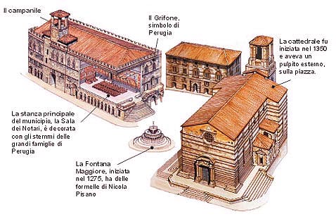 La Fontana Maggiore, in Piazza IV Novembre, è senz’altro una delle più belle opere duecentesche d’italia. Nata su disegno dei Pisano, probabilmente con la supervisione di Fra’ Bevignate, fu ornata di sculture da Nicola e Giovanni Pisano. Particolarmente interessanti gli specchi della vasca inferiore con i bellissimi bassorilievi rappresentanti i mesi dell’anno, i segni dello zodiaco, il leone guelfo e il grifo perugino, le sette arti liberali e la filosofia e alcune storie mitologiche.