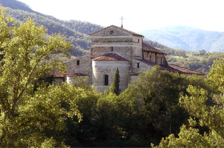 Nell’abside centrale, costruita in maniera mirabile fra le più belle e grandi del periodo romanico, si apre una finestra senza strombatura il cui arco di protezione è costruito con piccoli cunei di pietra e cotto alternati.
