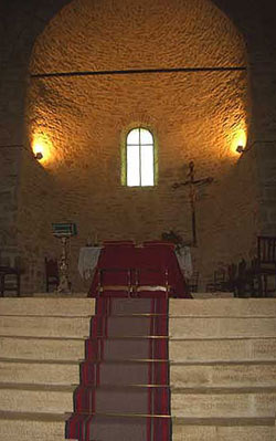Nell’abside centrale, costruita in maniera mirabile fra le più belle e grandi del periodo romanico, si apre una finestra senza strombatura il cui arco di protezione è costruito con piccoli cunei di pietra e cotto alternati.