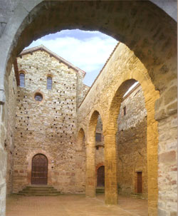 Le colonne dell’atrio, di forma poligonale, in pietra arenaria, hanno i capitelli molto bassi e smussati agli angoli, che ci ricordano lo stile lombardo.
