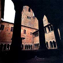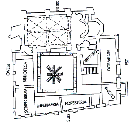 I contrafforti di sostegno della chiesa abbaziale, furono costruiti negli anni 1568-1569 da Pier Lorenzo Bernardi. L’abbazia, già verso il 1300, aveva, quindi, raggiunto la forma e le dimensioni attuali; sul lato nord la grande chiesa, a est i dormitori e il refettorio, ad ovest scriptorium e la biblioteca, a sud la foresteria con l’infermeria. Il grande chiostro che collega tutte le parti del monastero è costituito da due logge sovrapposte, realizzate con colonnine tra loro differenti.