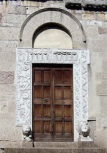 L’interno è a tre navate e degli splendidi affreschi che ricoprivano le pareti eseguiti da Ruggero da Todi, rimangono solo alcuni frammenti. Nel 1936, quando l’intero complesso architettonico era ridotto ad un rudere, il portale venne “sfilato” e venduto ad un antiquario; al suo posto oggi c’è una pregevole copia.