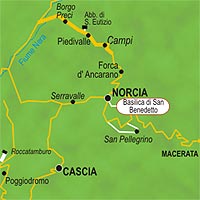 La Basilica di San Benedetto si presenta come un insieme armonico di diversi stili, testimonianza di nuovi interventi e rifacimenti. Sorge su quella che la tradizione identifica come la casa paterna di San Benedetto (480). Di fatto la cripta e le strutture connesse, riportate alla luce a partire dal 1910, mostrano che l’edificio cristiano è impiantato su un edificio pubblico romano.