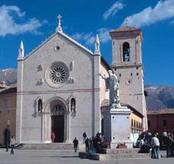 La Basilica di San Benedetto si presenta come un insieme armonico di diversi stili, testimonianza di nuovi interventi e rifacimenti. Sorge su quella che la tradizione identifica come la casa paterna di San Benedetto (480). Di fatto la cripta e le strutture connesse, riportate alla luce a partire dal 1910, mostrano che l’edificio cristiano è impiantato su un edificio pubblico romano.