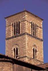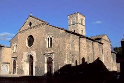 Si raggiunge il complesso francescano per le vie Fratini e, a sinistra, Nobili. La chiesa, eretta nel 1265, nel 1437 fu portata a tre navate ed ebbe aggiunta la cappella di S.Bernardino (transetto destro, distrutti dai bombardamenti dell’ultima guerra); fu rimaneggiata nel ‘600 e rinnovata dopo il terremoto del 1703. Ulteriori ampi restauri furono operati nel XIX e nel XX secolo, l’ultimo dopo le distruzioni belliche. La parte mediana della facciata ha un portale gotico sormontato da grande oculo; le pareti laterali, aggiunte nel ‘400, hanno portali dell’epoca e finestre gotiche; l’elegante campanile con bifore e quadrifore gotiche e coronamento di archetti intrecciati è opera di angelo da Orvieto (1345).