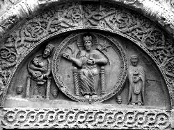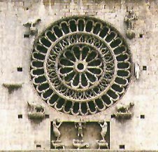 empi spoletini del Duomo e di San Pietro. E’ divisa orizzontalmente in tre zone: quella inferiore, del secolo XII, spartita in riquadri, ha tre portali fiancheggiati in basso da leoni e grifi. Il portale mediano, con ricchi ornamenti, presenta una ghiewra multipla scolpita con motivi di tralci, figure allegoriche, girali vegetali, animali mostruosi, gruppi figurativi e, nella lunetta, una lastra con bassorilievo: Cristo in trono, in un clipeo tra il sole e la luna, la Madonna che allatta e San Rufino.