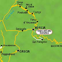 croce lobata e tetto a capanna. L’interno, a navata unica rettangolare con pavimento in pietra e soffitto ligneo, termina con una piccola area presbiteriale quadrangolare cui si affiancano due piccoli vani che ospitano la sacrestia. Il presbiterio è decorato da stucchi e affreschi seicenteschi che raffigurano i santi Eutizio, Spes, Fiorenzo, Santolo, Feliciano e Costanzo; nella volta Dio Padre con i quattro evangelisti e otto sante; sull’altare una sorta di trittico con i santi Benedetto e Gregorio Magno che affiancano una moderna statua di S.Scolastica, mentre l’antica statua è conservata nel palazzo Vescovile. Nel vano di sinistra è ben leggibile l’antica struttura del tempio e gli affreschi del XV sec. con una santa Scolastica e la clarissa beata Lucia da Valcaldara. Maggiore interesse suscita il ciclo pittorico che copriva originariamente tutte le pareti e che venne riscoperto casualmente nel 1978, alla vigilia delle celebrazioni catenarie della nascita di Benedetto e Scolastica del 1980. Mentre sulla parete destra e sulla controfacciata sono rimaste pochissime tracce, l’affresco si stende per oltre 100 mq sulla parete di sinistra e su quella di fondo con lacune dovute alla trasformazione della chiesa nel sec. XVIII, che suddivide lo spazio delle pareti laterali con arcate e pilastri, e all’opposizione di lastre tombali nei secoli successivi.L’affresco, così come oggi si conserva, narra le storie della vita dei santi Benedetto e Scolastica attraverso dei quadri che rappresentano con grande fedeltà il racconto di Gregorio Magno nel libro dei Dialoghi. L’interessante ciclo pittorico, della metà del sec. XV, venne a coprire affreschi precedenti di cui rimane un volto di S. Scolastica e una bella Madonna in Trono, con i santi Benedetto e Giovanni Battista, attribuita ai fratelli Salimbeni, pittori marchigiani operanti fra le Marche e l’Umbria.