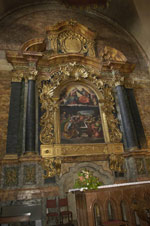 La parete di fondo è occupata da una crocifissione (il Crocifisso in legno dipinto è oggi fissato ad un sostegno davanti al presbiterio) tra la Vergine e S. Giovanni: nella zona soprastante è l’immagine del Padre Eterno tra la fede e la speranza.