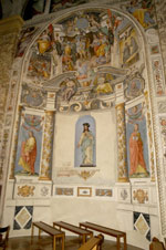 Inquadrate entro finte architetture sono le immagini di S. Francesco e S. Chiara. Tutti i pennacchi di raccordo tra il sesto delle nicchie e la base delle lunette sono decorati con immagini di Sibille.