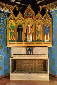 Ad opera e spesa del prete perugino Alessio, fu ingrandita la Chiesa di S. Costanzo al principio del 1200, sotto il pontificato di Innocenzo III, e fu consacrata al vescovo di Perugia, Viviano, nel 1205, reggendo il monastero di S.Pietro l’abate Rinaldo. Ne è testimonianza l’iscrizione latina di bei caratteri leonini, che ancora si può leggere sulla fronte della lastra marmorea che allora serviva da mensa dell’altare e che ora fa da sostegno al tabernacolo; riportiamo qui di seguito la traduzione: