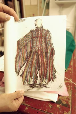 Giacomo ci illustra le caratteristiche di un costume che ancora deve essere terminato, dal suo bozzetto alla scelta della stoffa: il Narratore, e poi ci presenta ancora alcuni modelli “storici” e molto importanti come quelli di coloro che aprono il corteo. Abiti pesantissimi dalle stoffe compatte e ricche con accessori di grande impatto : ori e pietre dure, gli abiti dei nostri “Priori di Parte”.