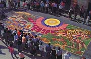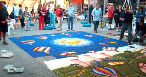 Il percorso delle vie principali si riveste di numerosissimi tappeti floreali che, ispirati a vari temi religiosi celebrano il Gesù nell’Eucarestia. La matrice antica, la ricorrenza rituale, la motivazione più intima, richiamano sicuramente ad una profonda ragione religiosa, legata al costume, ormai non più databile, di deporre petali al passaggio processionale delle sacre immagini. La passione e l’entusiasmo della gente, il competente lavoro di ricerca e di applicazione, la faticosa partecipazione di cittadini di ogni età, costituiscono invece un grosso fatto popolare, dove comunione di intenti, organizzazione mirata e collaborazione spontanea confluiscono nel tutto unico da realizzare finale: i meravigliosi tappeti che, intercalati da geniali quadri floreali, si offrono agli sguardi ammirati delle svariate migliaia di visitatori e turisti che affluiscono da ogni parte d’Italia e dall’estero.
