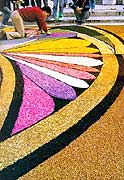E’ il risultato di un complesso e difficile lavoro che richiede giorni e giorni, settimane e settimane di paziente e sapiente opera di molte persone, che a gruppi si distribuiscono i compiti e si attivano con indispensabile armonia di intenti: ricerca e raccolta di fiori, cura e mantenimento di essi, capatura e selezione di petali, studio del bozzetto, predisposizione di strutture antipioggia e antivento, particolari impianti di illuminazione. Infine, durante il pomeriggio e la notte del sabato che precede la festa, gli infioratori lavorano sulle strade, chini a terra per disegnare,deporre e disporre milioni e milioni di petali capaci di produrre quei magici capolavori che sanno di arte antica e moderna, carichi di suggestioni emotive e culturali, collegati ai temi della tradizione ed anche dalla più viva attualità.