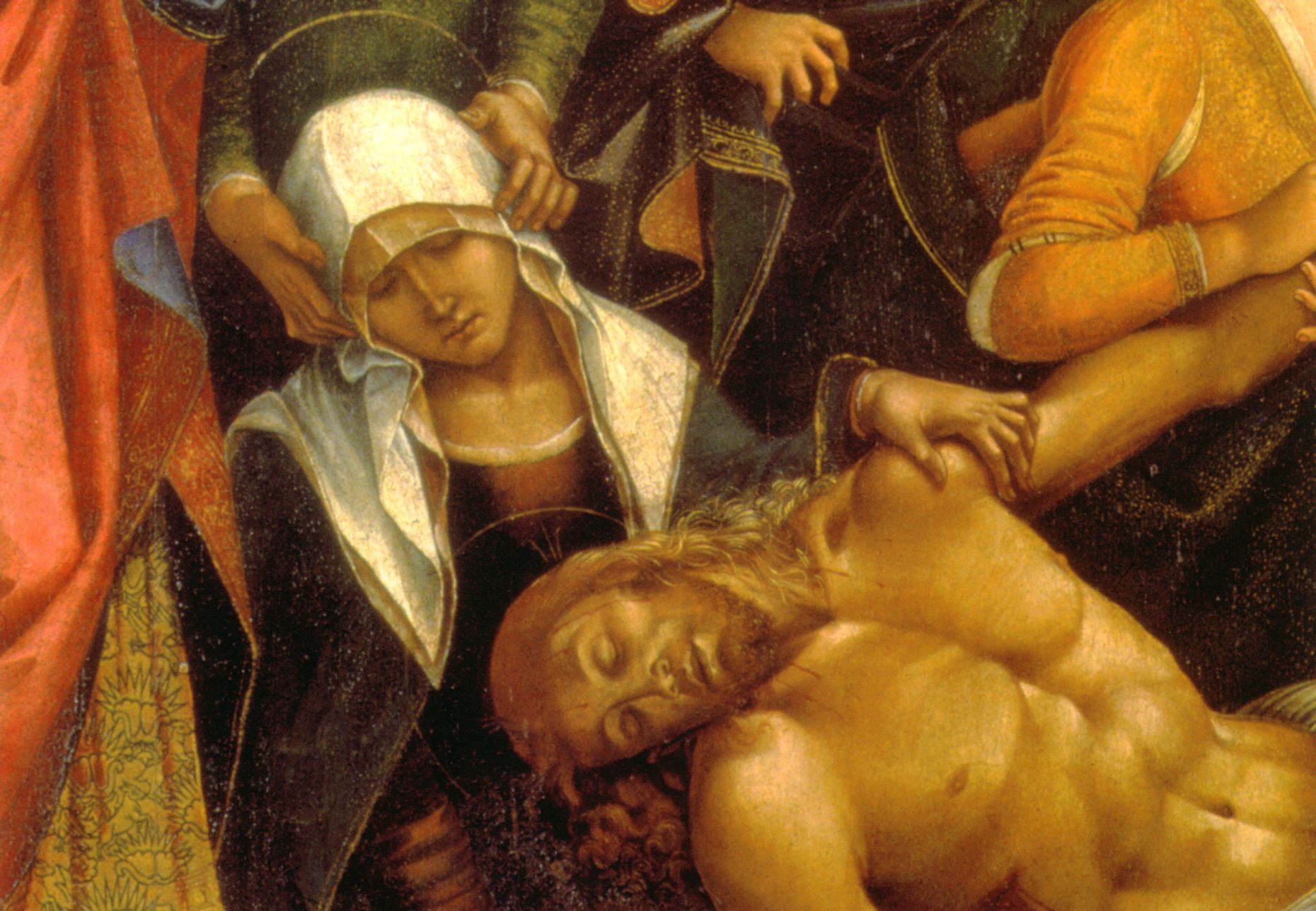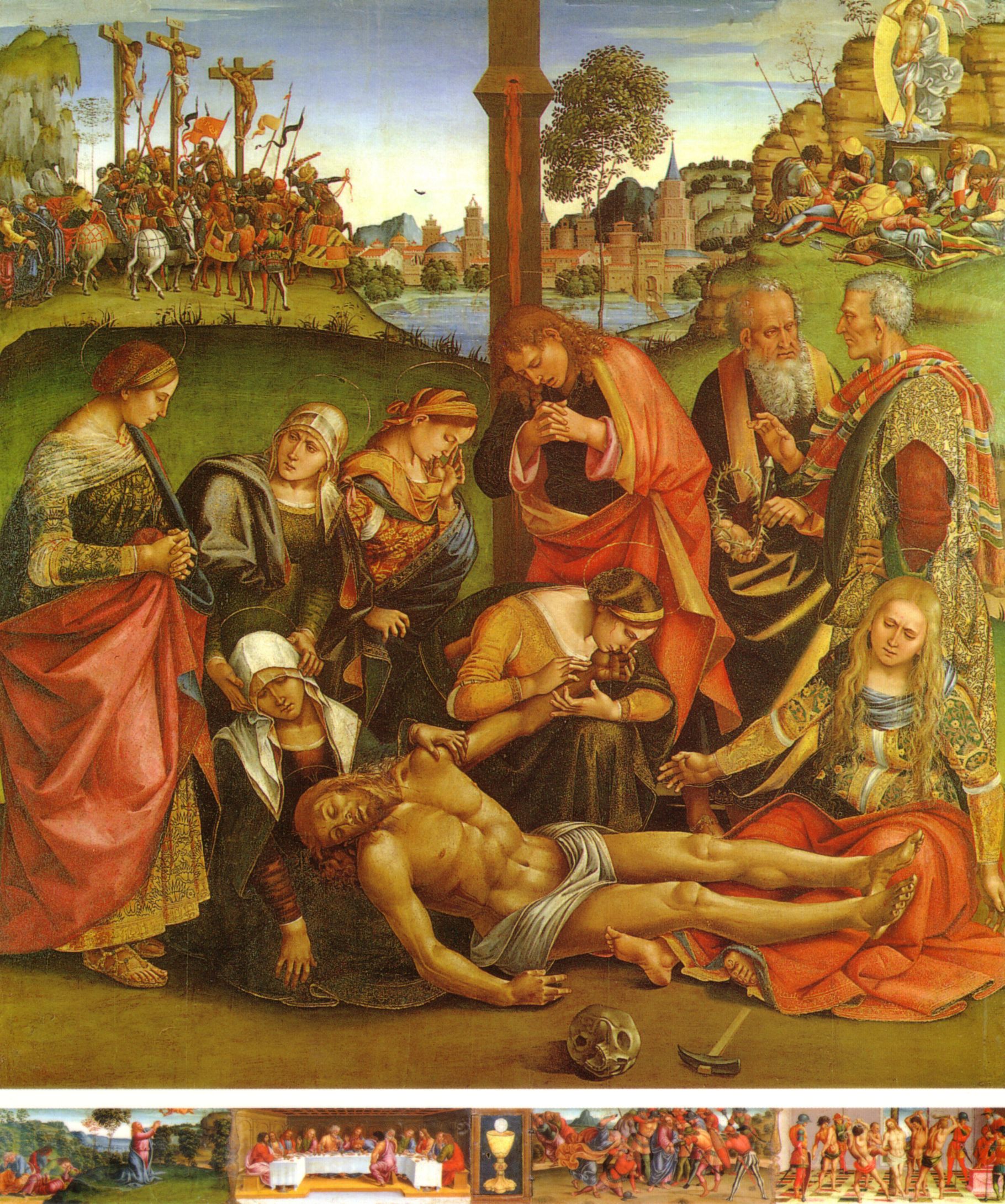 Nella staticità delle figure, viste in un momento di sospesa e bloccata drammaticità, sono forti i legami con le sacre manifestazioni popolari. Al nudo del Cristo è collegato il racconto del Vasari che ne fa il ritratto del figlio morto di peste nel 1502. Il quadro venne dipinto nel 1502 per l’altare maggiore della chiesa di Santa Margherita.