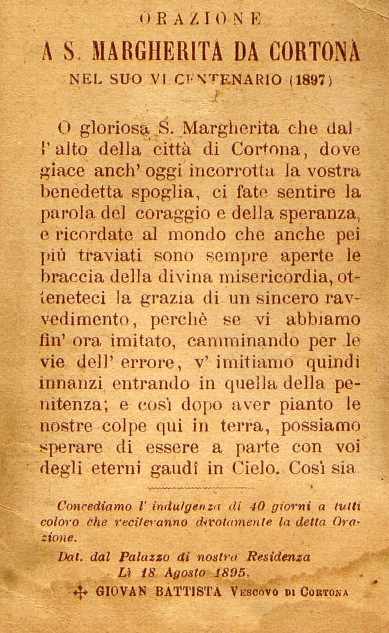 Il suo corpo è conservato a Cortona, nella basilica a lei intitolata, in un’urna collocata sopra l’altare maggiore, bordata da una cornice in lamina d’argento sbalzata e cesellata.
