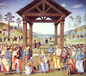 Attaccato alla chiesa c’è L’Oratorio di Santa Maria dei Bianchi. Ha la facciata in laterizio; qui si conserva “l’Adorazione dei Magi” del Perugino ritornato all’antico splendore cromatico dopo il restauro del 1984. È forse l’affresco più ricco e affollato del Maestro pievese, con un vasto paesaggio, dove si muovono i personaggi come in un grande corteo cavalleresco, a rappresentare un mondo irreale del tutto contrastante con la feroce realtà storica del tempo a Castel della Pieve. Questo bassorilievo è come una novella delle corti rinascimentali, in cui il mondo antico e moderno affermano la loro continuità ideale; a dimostrazione di ciò sta il fatto che i re Magi indossano la toga romana e vesti ornate di damasco, San Giuseppe ricorda un senatore romano, la capanna rimanda ad un tempio classico, al centro ci sono i pastori con le pecore che rappresentano l’Arcadia virgiliana. Tutta la scena è inserita in un paesaggio primaverile, che contrasta con la realtà storica della nascita di Cristo, ma, come la primavera è la stagione in cui la natura rinasce, così la nascita di Cristo segna la rigenerazione del mondo. Sullo sfondo il paesaggio ricorda il panorama di Città della Pieve verso il lago Trasimeno e la Val di Chiana, non è però un paesaggio realistico, ma rielaborato e tradotto su un piano ideale alla ricerca della perfezione. L’affresco può in conclusione essere definito “pittura di storia” nel senso che deve fornire insegnamenti (ecco perché il tempio classico e le figure centrali), ma anche dilettare gli occhi (a questo scopo le figurine di contorno). Proseguendo la nostra camminata, incontriamo, poco più avanti rispetto all’Oratorio, dalla parte destra, Palazzo Giorgi-Taccini. Fu costruito nel 1820 dall’architetto Giovanni Santini che già aveva progettato il Teatro degli Avvaloranti ed il campanile di Santa Maria dei Servi. L’edificio presenta una facciata molto lunga rispetto alla sua altezza, ma ciò fu dettato dall’esigenza di non togliere luce all’edificio antistante, dove si trova l’affresco del Perugino. L’architetto è riuscito ugualmente a dare un’idea di armonia e di proporzione grazie alla sua abilità nel mescolare i toni cromatici del travertino e dell’intonaco, oggi però quasi del tutto scomparso. Subito dopo troviamo Casa Canestrelli. E’ un’abitazione del 1300 con la tipica struttura del lotto gotico a tre aperture, che in questo edificio è ancora possibile leggere perfettamente.