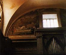 E’ una pittura molto drammatica, che raffigura Cristo deposto dalla croce, Maria svenuta e sostenuta dalle altre donne e gli Apostoli in meditazione sul messaggio di Cristo. Sull’altro lato c’è una Pietà del Cristo Morto; al centro di questa c’è una nicchia vuota, che, in passato, conteneva una scultura dipinta, attualmente sull’altare maggiore. In questi affreschi si nota una pennellata molto veloce, come se l’artista, giunto ormai alla vecchiaia e preso da un impeto religioso, temesse di non fare in tempo a terminare la sua opera.