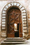 del loro territorio. Riprendiamo a percorrere la Via dell’Alpe di Serra, che non sfonda davanti alla chiesa, ma segue l’andamento del nucleo originario della città, girandogli intorno. La via scende nell’odierna Via Roma, in passato Via del Vecciano (Vetus lanua = Vecchia Porta), termine che allude ad una porta precedente rispetto a quella attuale, che guardava a Nord-Est, verso Perugia, ed era posizionata alla fine del castrum longobardo; la porta attuale, invece, guarda verso Sud, cioè verso Roma e, come quella fiorentina, è stata rimodernata dopo il “Concordato Idraulico”. Scendendo lungo via Roma incontriamo, sulla destra, Palazzo Bandini. Intorno alla metà del 1400, nel periodo delle Signorie, a Castel della Pieve avvennero degli scontri tra le varie famiglie fino a quando quella dei Bandini riuscì, con il consenso di Perugia, a prendere il potere su Castel della Pieve. Famiglia di origine orvietano-senese, edificò un palazzo signorile, che si affaccia verso la Piazza Pubblica, nell’odierna Via Roma, in prossimità di Porta Romana, che collegava la città con Salci, possedimento della famiglia. Questo edificio, progettato da Baldassarre Peruzzi, che aveva già costruito per i Bandini la fortezza di Fabro, presenta tre piani, uno terreno e due superiori, sottolineati dai marcapiani in pietra serena. II palazzo è stato costruito su una base di precedenti edifici uniti insieme e coperti per mezzo dell’intonaco. In seguito è stato abbandonato e diviso in varie proprietà. Il portale, a tutto sesto, si ispira all’architettura classica, infatti ricorda un arco trionfale. .jpg)