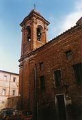 Ingresso da Porta Fiorentina. Si entra nella città per la Porta Fiorentina che, come è evidente, non è terminata (infatti manca l’arco). L’attuale non è l’antica porta medievale, ma è stata costruita intorno al 1820 in omaggio al progresso ed anche per permettere l’entrata in città a mezzi di trasporto di maggiori dimensioni. Siamo in via P. Vannucci, una via larga con andamento ondulato e curvilineo dovuto probabilmente ad esigenze di tipo difensivo. Infatti nella prima società comunale esistevano due classi sociali, quella dei Cavalieri, cioè gli aristocratici che potevano permettersi l’uso del cavallo in guerra, e quella dei Pedoni, cioè i contadini inurbati che usavano l’arco e la balestra. Tra queste due classi erano frequenti gli scontri e la città, quindi, era organizzata a seconda delle esigenze difensive dei due ceti.