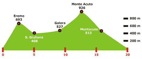 Prima di partire, vale la pena di visitare la cripta della Badia di San Salvatore, fondata nel 1008 da San Romualdo: alcuni elementi di essa fanno pensare a origini ancora più remote di quelle tramandateci. Lasciando sulla destra la Badia (240 m.), dopo avere attraversato un ponticello, si prende una strada bianca che inizia subito a salire. La strada, denominata “mattonata“, costeggia boschi di roverella e vigneti e molto numerose appaiono le ginestre. In località Pod. San Savino (516 m.) si può scegliere, voltando a destra, di percorrere il sentiero verso S. Giuliano delle Pignatte (357 m.), o di proseguire, tenendo la sinistra verso l’Eremo di Monte Corona, situato a quota 693 m. s.l.m..