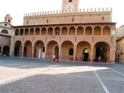 Costruito tra il XIII e il XIV secolo (torre centrale merlata). La facciata è preceduta da un portico a 7 arcate con un’elegante loggetta a 14 arcate alzata nel XV secolo. All’interno vi è una piccola pinacoteca con opere di Pietro Alamanno e Simone de Magistris da Caldarola. Nell’archivio storico comunale si conserva, tra l’altro, il catasto pergamenaceo mutilo del XIV secolo forte di ben 70 pergamene in caratteri gotici.