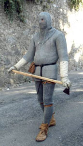 Risposta: In tutte le uscite che faccio sono accompagnato da Luca Rossi, un ragazzo che condivide la mia passione ed al quale cerco di insegnare il poco che conosco. Siamo disponibili ad essere presenti in manifestazioni medievali, purché tengano conto del lavoro di ricostruzione storica e non solo di commercio. In manifestazione facciamo dimostrazioni di lavorazione di maglia di ferro, a partire dalla creazione dell’anello all’ intreccio e della battitura a freddo di Umboni, Elmi e corazze su stampi in legno.