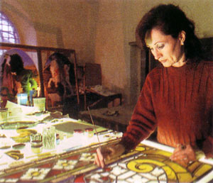 Un’arte che per mano del suo fondatore, Francesco Moretti, e di suo nipote Ludovico Caselli, diede vita a Perugia e non solo, sin dagli inizi, ad una serie di opere straordinarie. Anna Falsettini ne ricorda alcune: le vetrate della basilica di Santa Maria degli Angeli, quelle della cattedrale di San Lorenzo a Perugia e del duomo di Orvieto. Moretti restaurò, fra le altre, anche la grande vetrata di San Domenico a Perugia e quella del duomo di Orvieto. Rosa e Cecilia, realizzarono invece quelle della basilica di Santa Chiara ad Assisi e una grande vetrata di 40 mq raffigurante I’Ultima Cena di Leonardo da Vinci, ubicata presso il cimitero monumentale di Glendale, a Los Angeles, in California. Di queste opere lo studio conserva ancora i bozzetti, i disegni preparatori, anch’essi prodotti di vera perizia artistica. Partendo dagli schizzi e dai bozzetti, passando per il disegno a grandezza reale, racconta Anna Falsettini, si arriva alla scelta e al taglio del vetro. Poi si passa al colore che in ultimo viene fissato con la cottura nel forno, anche tre o quattro volte. Infine si procede alla legatura a piombo per assemblare le singole tessere di vetro. Una tecnica antica, che oggi viene integrata da nuovi studi e progettazioni. Per chi fosse interessato il laboratorio organizza, dietro prenotazione, delle visite guidate nel corso delle quali sarà possibile assistere ad una dimostrazione dei vari passaggi per la lavorazione del vetro, ma organizza anche dei corsi specifici su questa particolare tecnica. Si potranno così ammirare gli stupendi saloni, che ancora oggi conservano intatto l’impianto quattrocentesco, oltre gli affreschi d’epoca, restaurati dallo stesso Francesco Moretti. All’interno sono state raccolte fotografie dei tempi passati, bozzetti e disegni, piccole vetrate e oggetti d’arte raccolte dai proprietari nel corso del tempo. In un angolo, dove la luce crea un effetto straordinario, si erge la grande vetrata raffigurante la regina Margherita di Savoia.